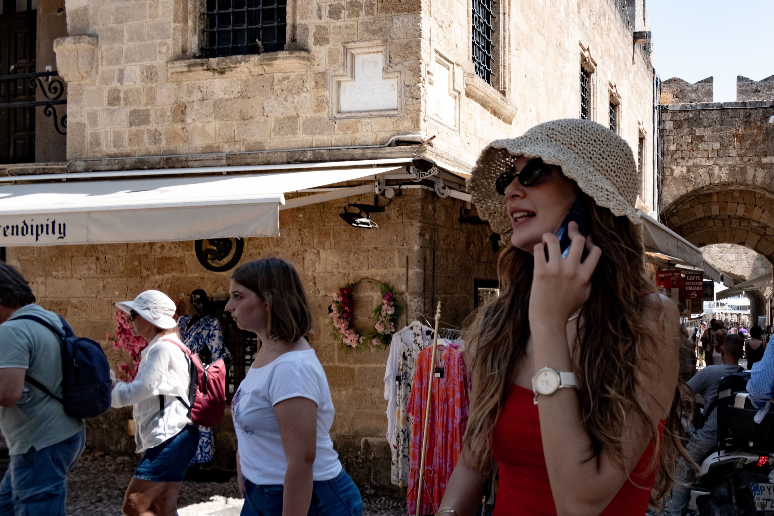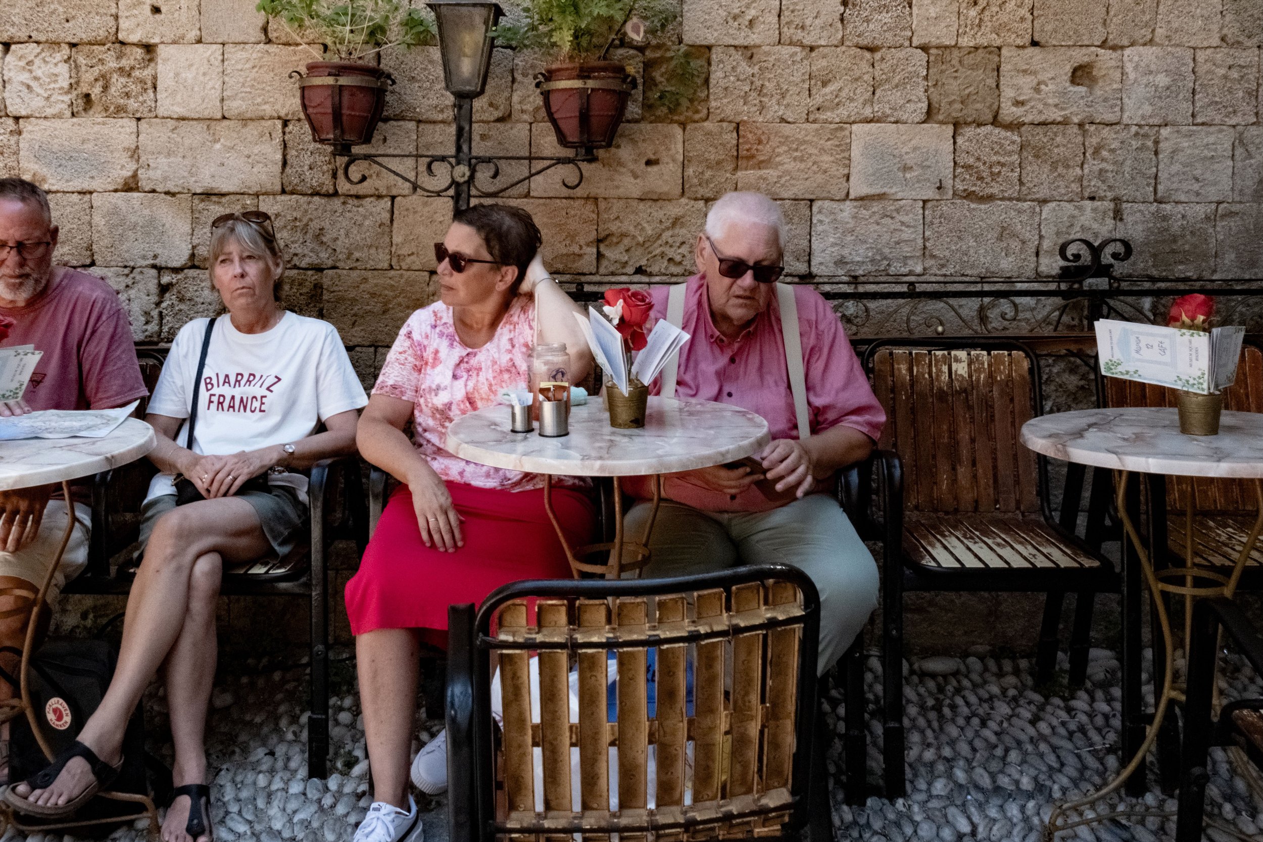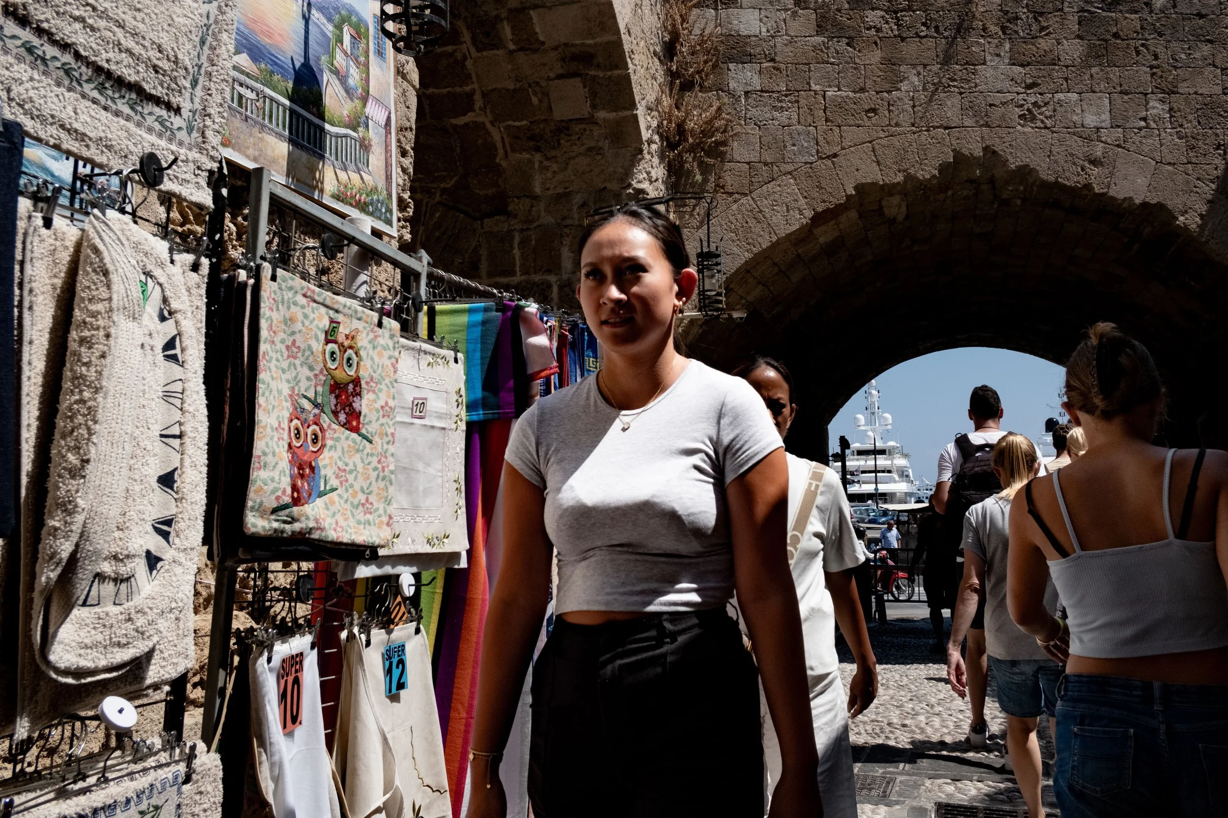 Zwischen Tourist:innen und Einheimischen, Souvenirläden, Cafés, Eisdielen und kleinen Restaurants spielte sich das pralle Leben ab. Ich liebe es, wenn sich authentische Momente ganz beiläufig ergeben – genau das war hier der Fall. Es war ein Zusammenspiel aus neugierigen Blicken, flüchtigen Gesten, kurzen Begegnungen und diesem ganz besonderen Flair, das die Altstadt von Rhodos ausmacht.